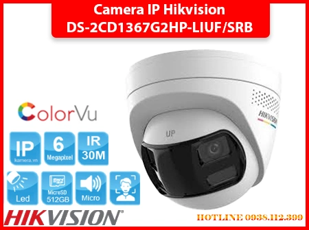 Camera ColorVu DS-2CD1367G2HP-LIUF/SRB ghi hình màu 24/7 với độ phân giải 6MP sắc nét, góc nhìn siêu rộng 180°, hỗ trợ đèn hồng ngoại và ánh sáng trắng tầm xa 30m. Tích hợp micro, loa, khe thẻ nhớ đến 512GB, đèn cảnh báo xanh đỏ và chống nước IP67, thích hợp giám sát ngoài trời hiệu quả